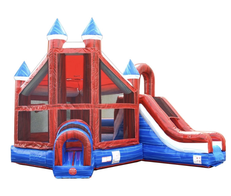 Our Red White & Blue Patriotic Themed Bounce Slide Combo is sure to be a hit at your next event! This unit features a Large Bounce Area, an Interior Basketball Hoop and a Giant Exterior Slide. The fun never stops. Perfect with large net windows to keep things cool for players and allows parents to keep an eye on activities inside.